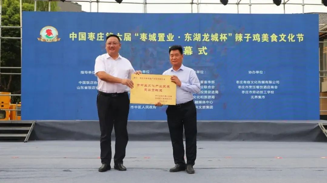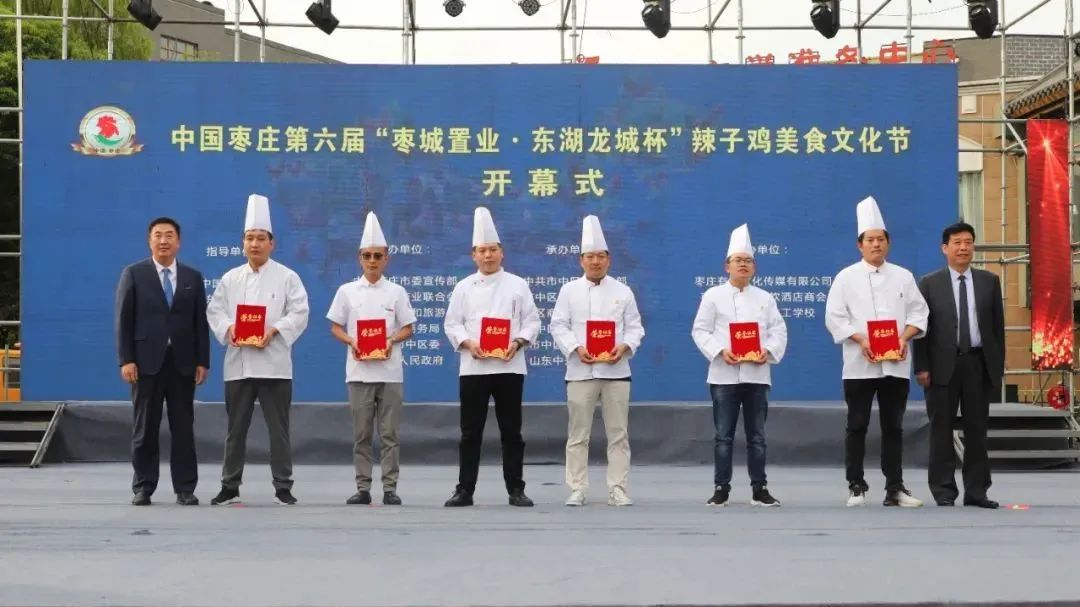 開(kāi)幕式上,中國(guó)飯店協(xié)會(huì)副會(huì)長(zhǎng)、中國(guó)飯店協(xié)會(huì)名廚委員會(huì)主席石萬(wàn)榮發(fā)來(lái)了祝賀視頻。企業(yè)家代表山東棗城置業(yè)有限公司董事長(zhǎng)殷允夷致賀詞。與會(huì)領(lǐng)導(dǎo)分別為“全雞宴”美食賽獲獎(jiǎng)團(tuán)隊(duì)、首屆“慢品市中”美食評(píng)選獲獎(jiǎng)單位、市中區(qū)文化產(chǎn)業(yè)發(fā)展突出貢獻(xiàn)獎(jiǎng)獲獎(jiǎng)單位頒獎(jiǎng),并共同啟動(dòng)第六屆辣子雞美食文化節(jié)。