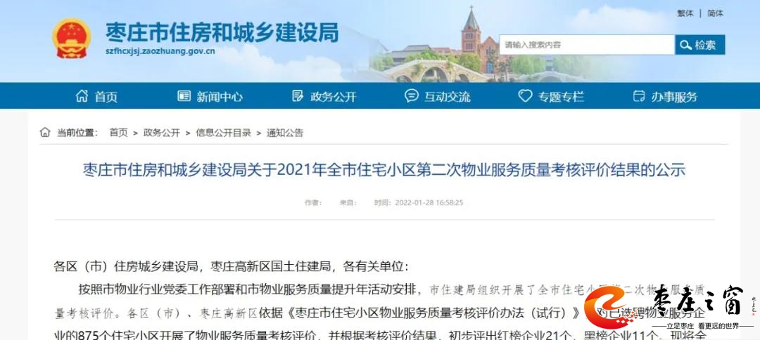 近日棗莊市住房和城鄉(xiāng)建設(shè)局發(fā)布《關(guān)于2021年全市住宅小區(qū)第二次物業(yè)服務(wù)質(zhì)量考核評價(jià)結(jié)果的公示》